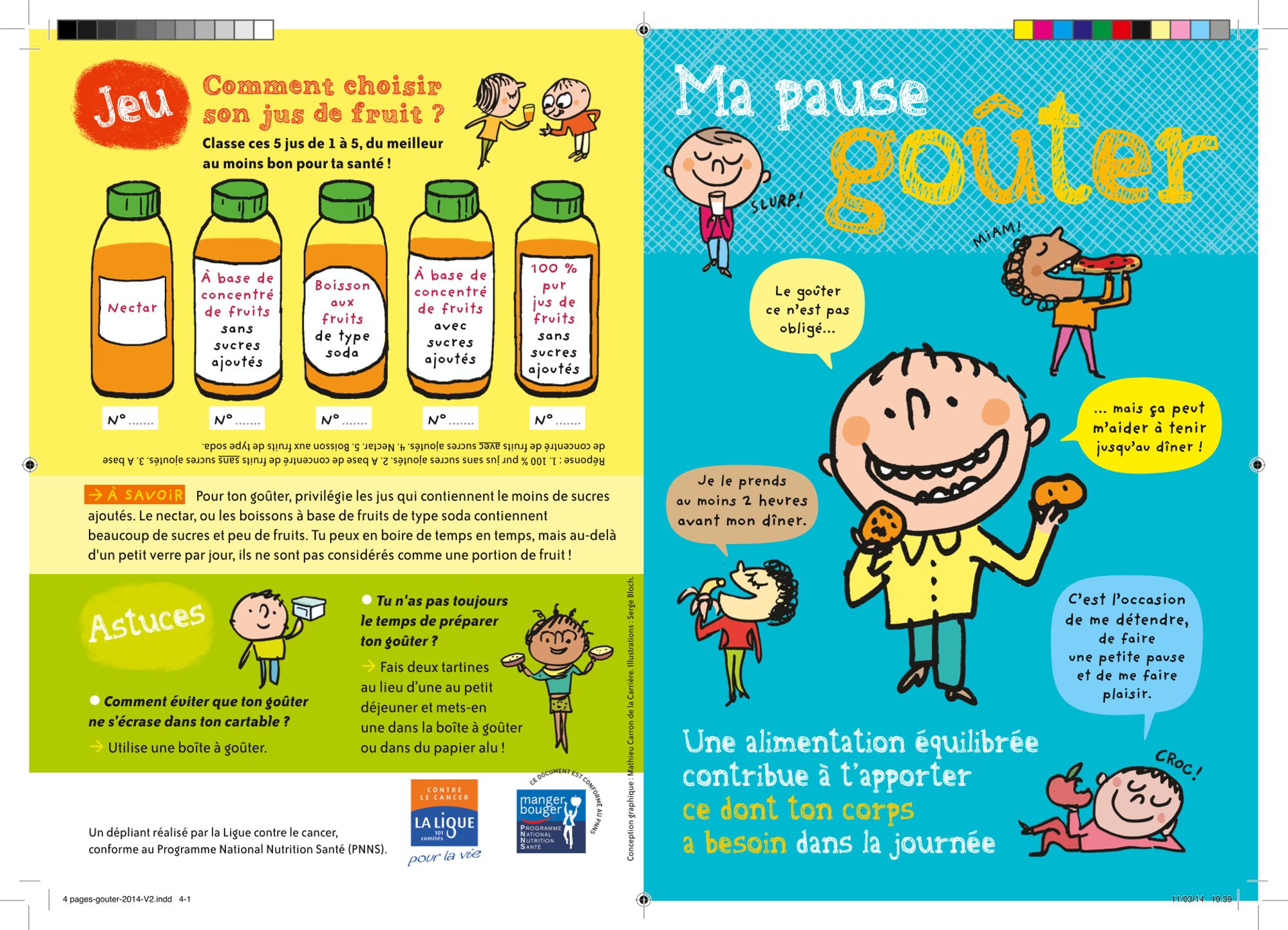 Cette exposition est imprimée à partir d'une plaquette sur la pause goûter. Ce format permet ainsi de travailler sur les recommandations alimentaires de la collation avec un groupe.