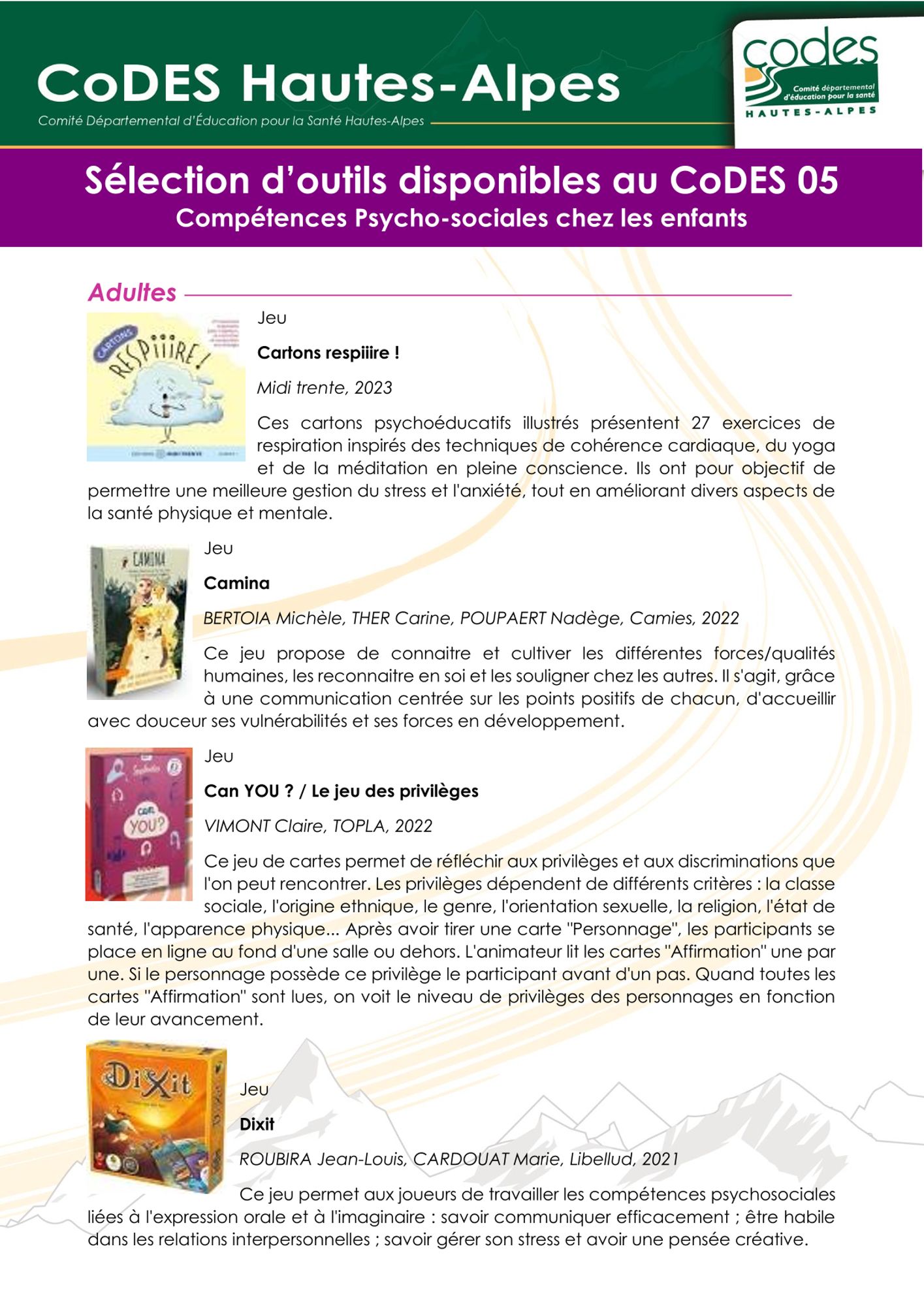 Echanges de pratiques - Atelier de présentation d'outils - Compétences psychosociales : Jeudi 13 Juin 2024 Ressources pédagogiques Powerpoint Journée (3.8 Mo) Sélection outils Compétences psychosociales Juin 2024 (646.7 Ko)