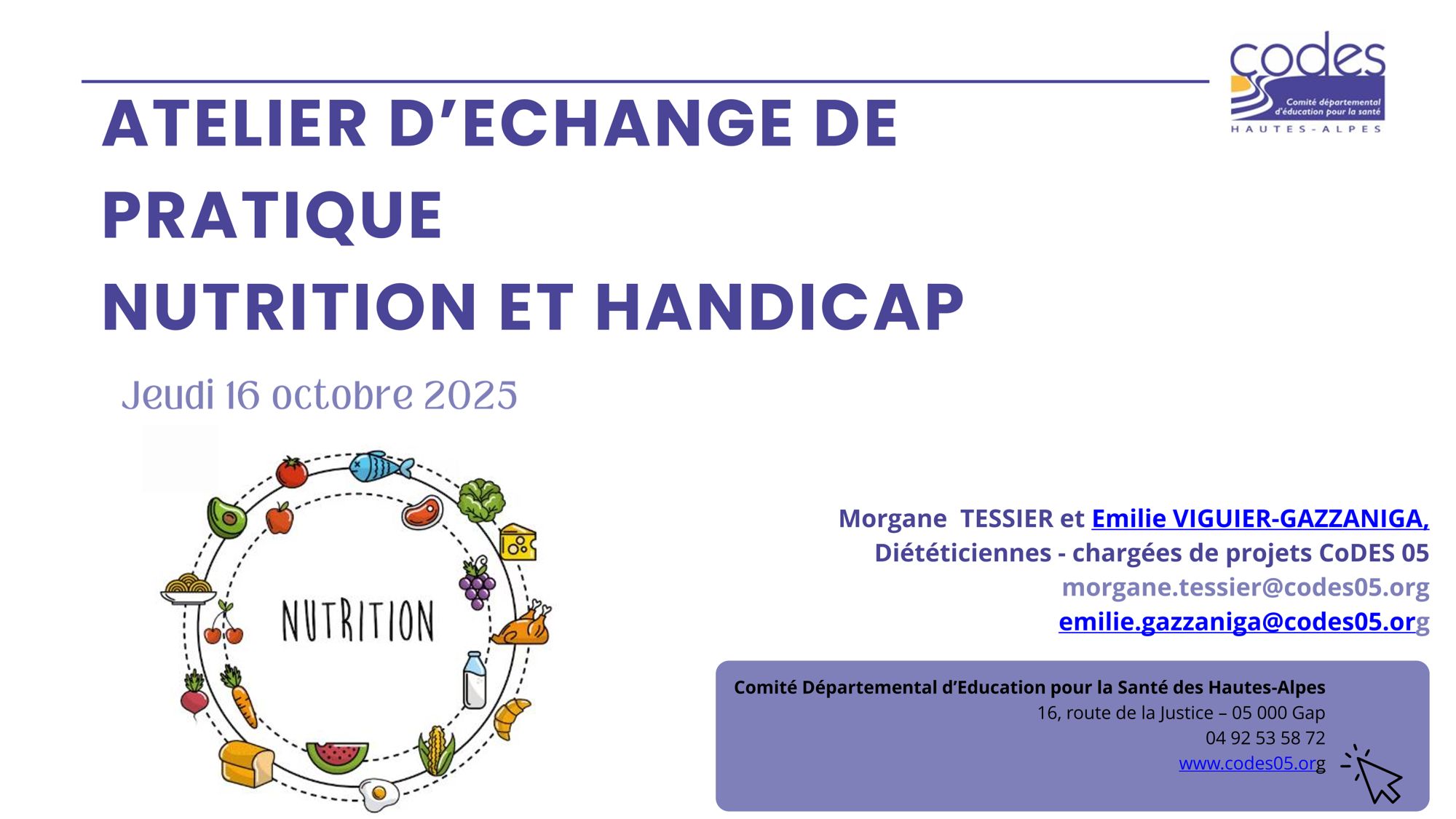 Echange de pratiques - Nutrition et Handicap Octobre 2025 Les présentations de la journée Présentation de la journée (2.8 Mo) Documents ressources Le Manger Mains - IREPS Bourgogne Franche-Comté - (7.2 Mo) Guide Nutrition 3S - Adapei Loire - (53.5 Mo) Troubles de l'alimentation et handicap mental / Guide pratique - Réseau Lucioles (21.9 Mo) Troubles de l'alimentation et handicap mental / Connaissances Approfondies - Réseau Lucioles (29.4 Mo) Autisme, des enfants bien dans leur assiette (3.7 Mo) Bien bouger pour prendre soin de ma santé - Santé BD (2.1 Mo) Mieux manger pour prendre soin de ma santé - Santé BD (5.3 Mo) GUIDE D’ACTION POUR LES PERSONNES EN SITUATION DE HANDICAP (ENFANTS/ADULTES) (2.5 Mo) PARAD en Falc (6.3 Mo) Préconisation Sport Autisme (3.5 Mo) Trouble de la déglutition (856.0 Ko) Fiche "L'hydratation" (973.2 Ko) Fiche " La dénutrition" (1.0 Mo) Fiche "La dénutrition" - CERIN (261.4 Ko) Diagnostic de la dénutrition chez l’enfant, l’adulte, et la personne de 70 ans et plus - HAS (361.8 Ko) Site internet Mangerbouger.fr Santé Bd : Banque d'images et BD pour facilité l'accès à la santé pour tous Réseau Lucioles - Alimentation et Oralité -