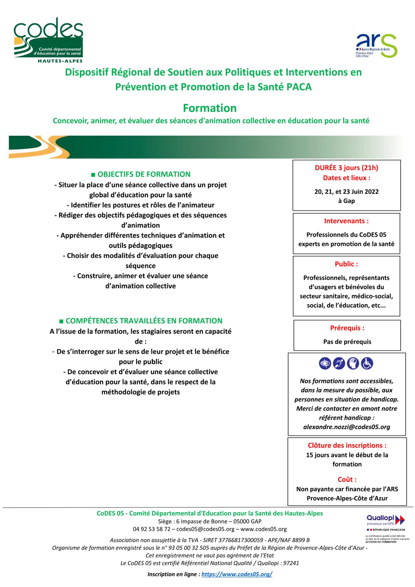 La formation est financée par l’ARS. Elle est gratuite pour les participant.e.s. Les frais de déplacement et de repas sont à la charge des participant.e.s.