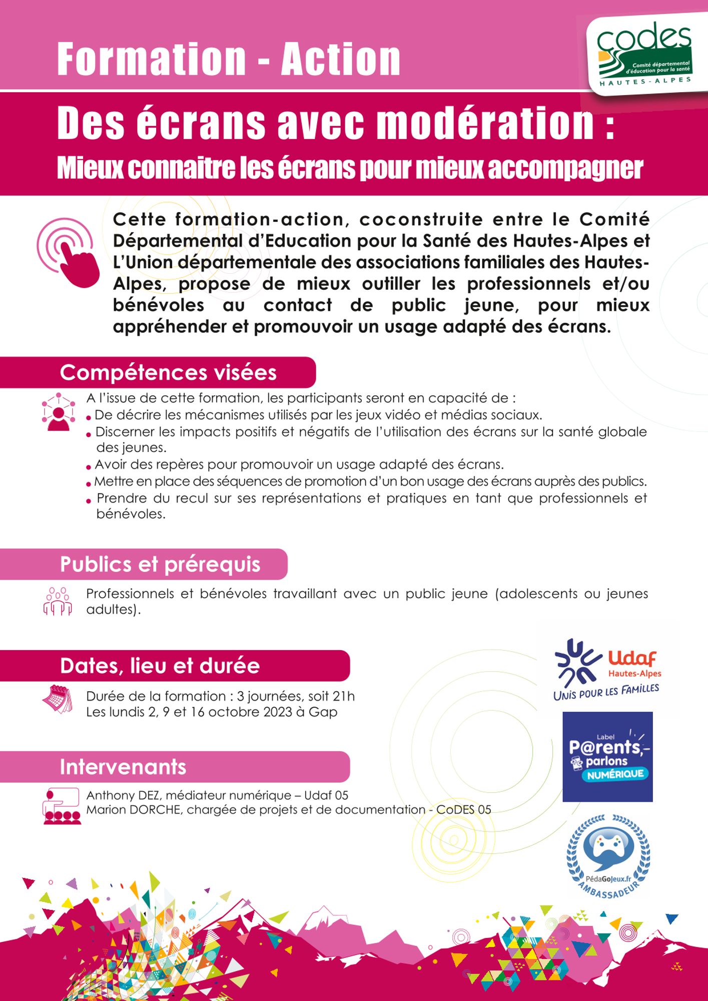 Cette formation-action, coconstruite entre le CoDES 05 et l'Udaf 05, propose de mieux outiller les professionnels et/ou bénévoles au contact de public jeune, pour mieux appréhender et promouvoir un usage adapté des écrans.