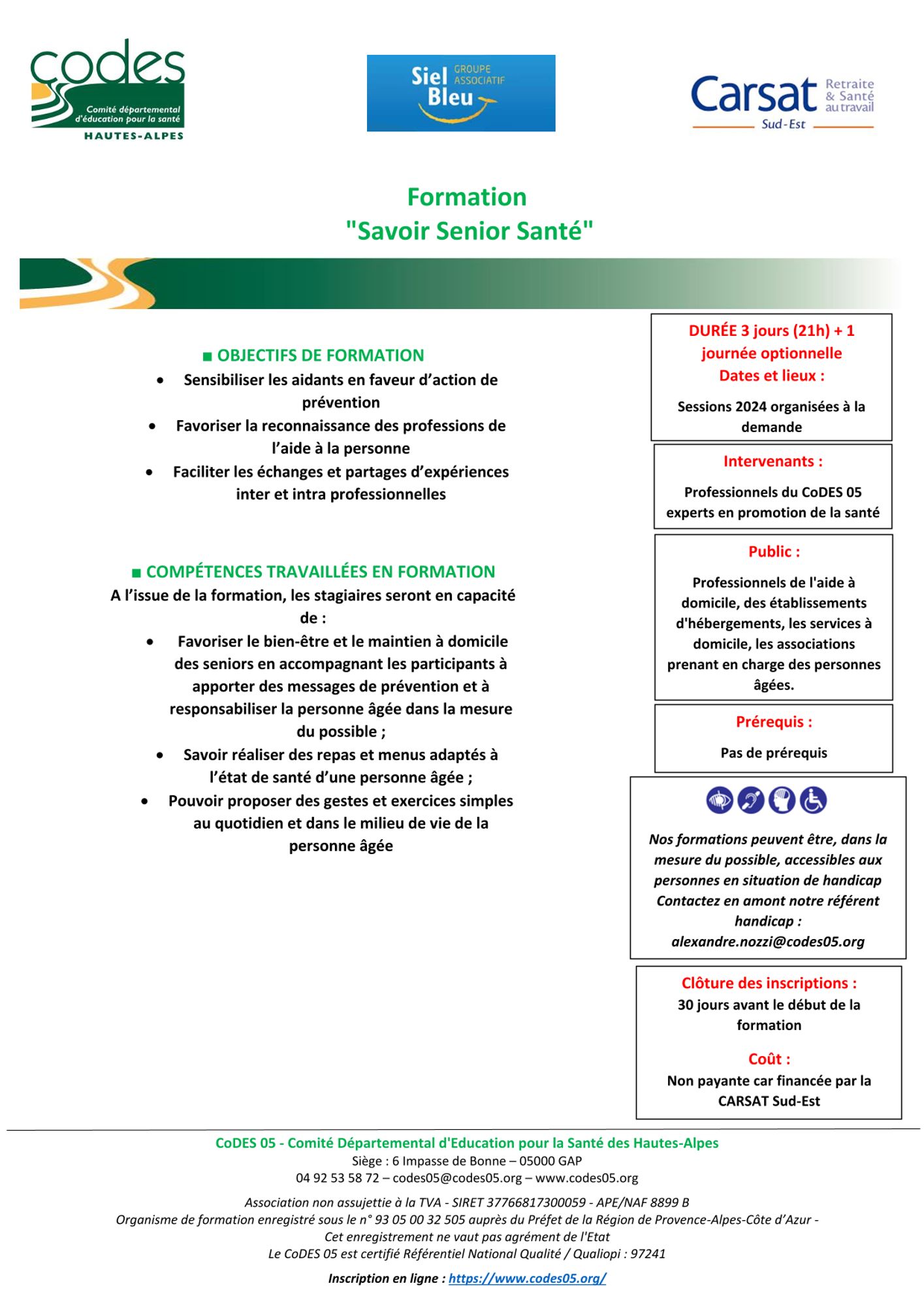 Merci de contacter en amont notre référent handicap : alexandre.nozzi@codes05.org