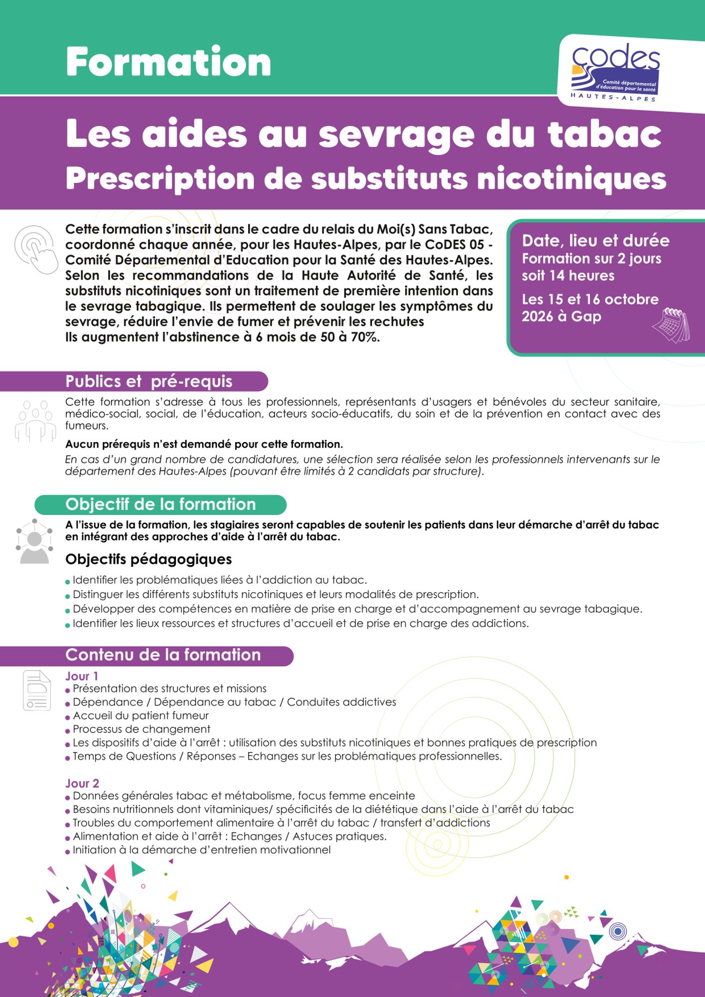 Cette formation s’inscrit dans le cadre du relais du Moi(s) Sans Tabac, coordonné chaque année, pour les Hautes-Alpes, par le CoDES 05 - Comité Départemental d’Education pour la Santé des Hautes-Alpes.