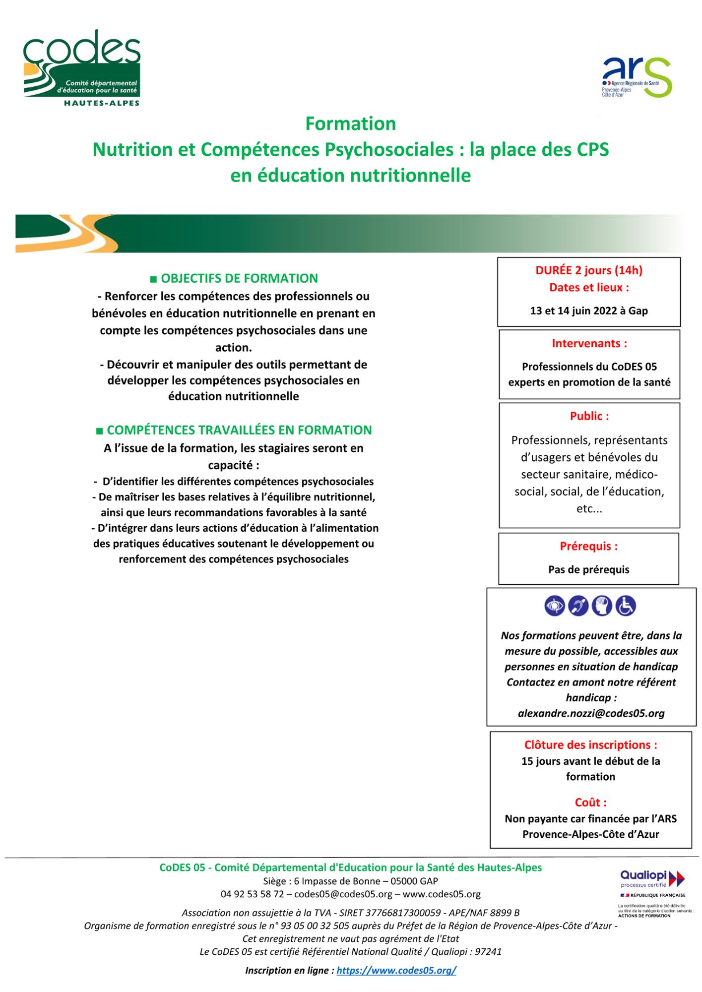 La formation est financée par l’ARS. Elle est gratuite pour les participant.e.s. Les frais de déplacement et de repas sont à la charge des participant.e.s.