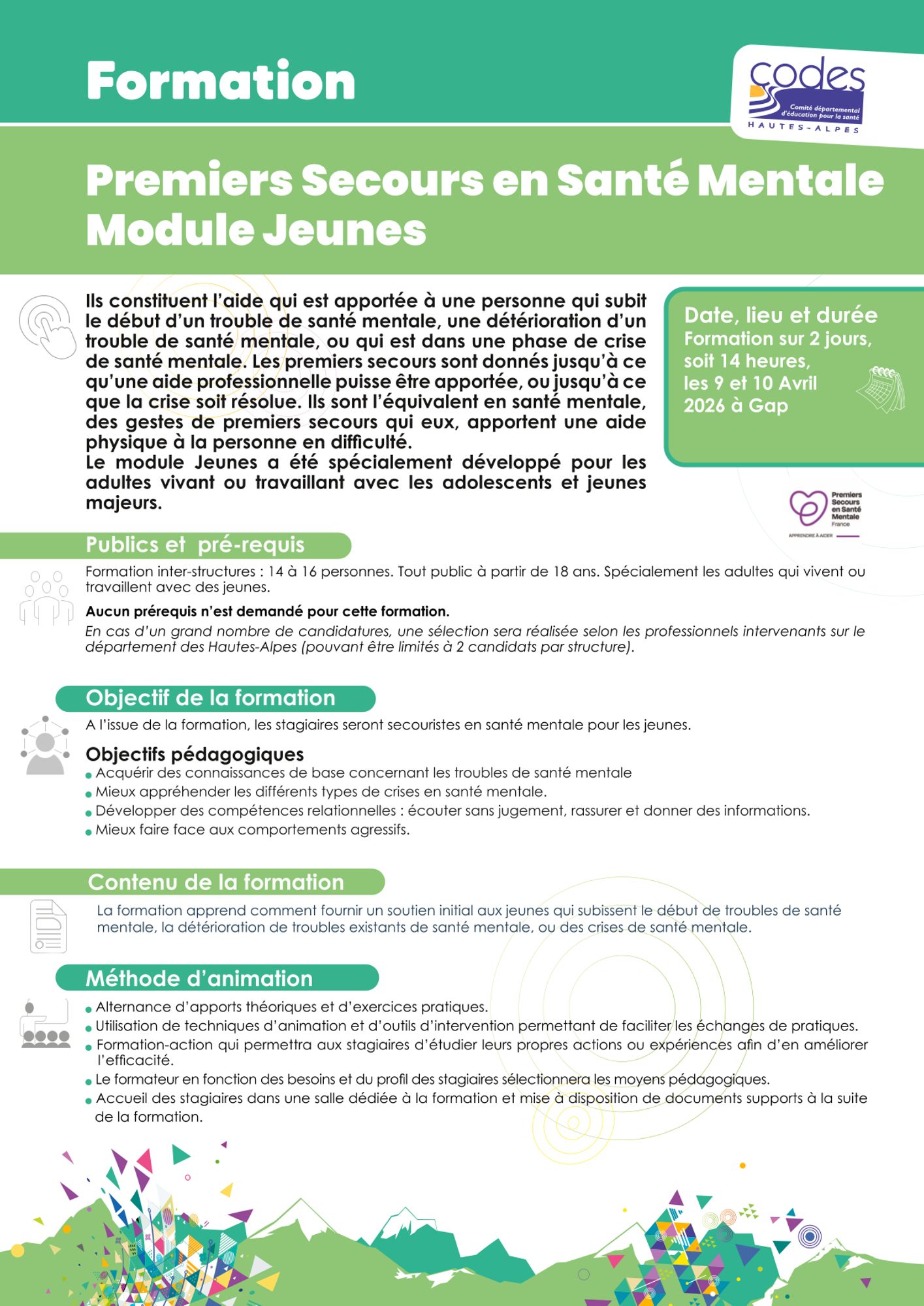 La formation apprend comment fournir un soutien initial aux jeunes qui subissent le début de troubles de santé mentale, la détérioration de troubles existants de santé mentale, ou des crises de santé mentale.