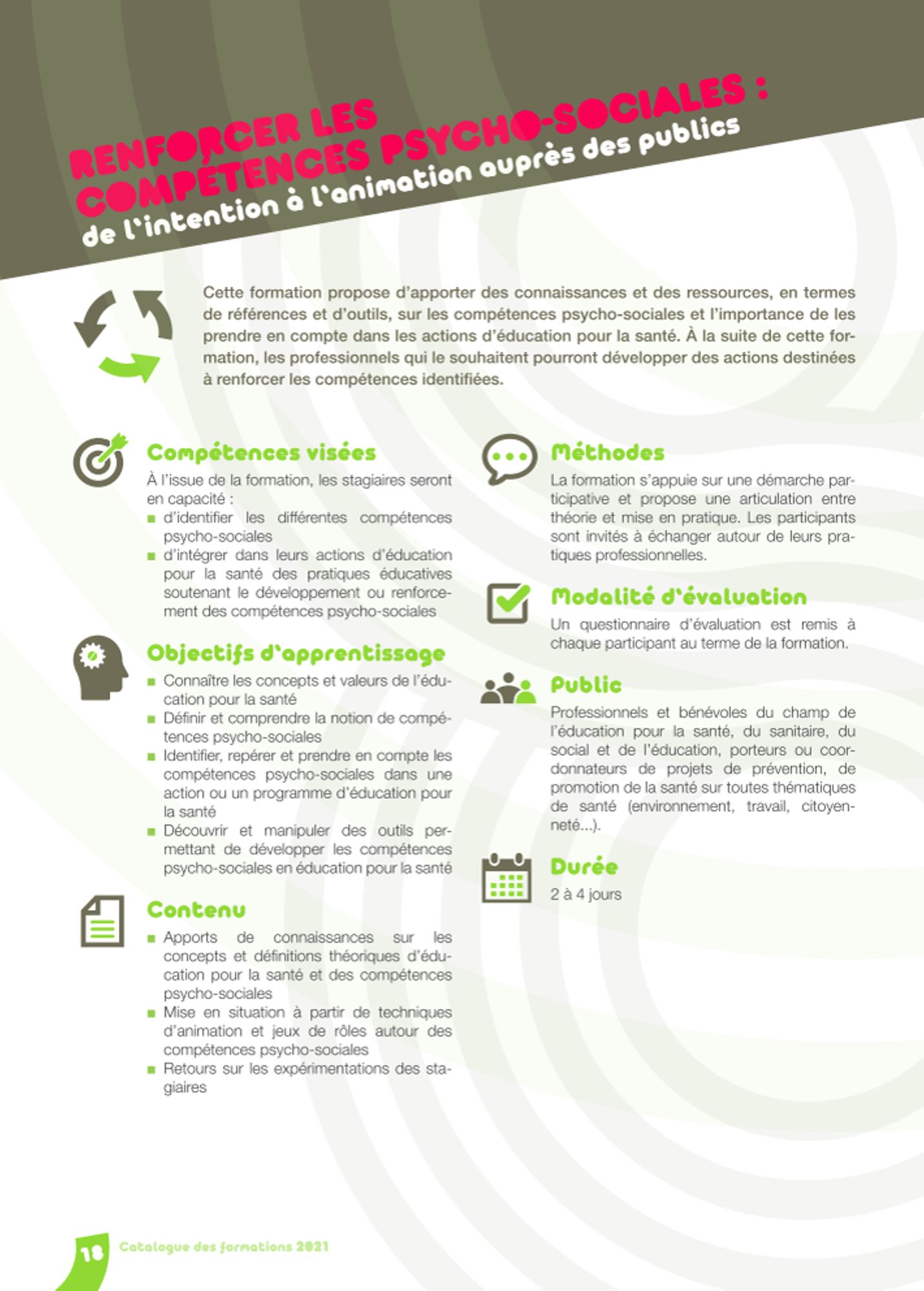 Cette formation propose d’apporter des connaissances et des ressources, en termes de références et d’outils, sur les compétences psycho-sociales et l’importance de les prendre en compte dans les actions d’éducation pour la santé. À la suite de cette formation, les professionnels qui le souhaitent pourront développer des actions destinées à renforcer les compétences identifiées.