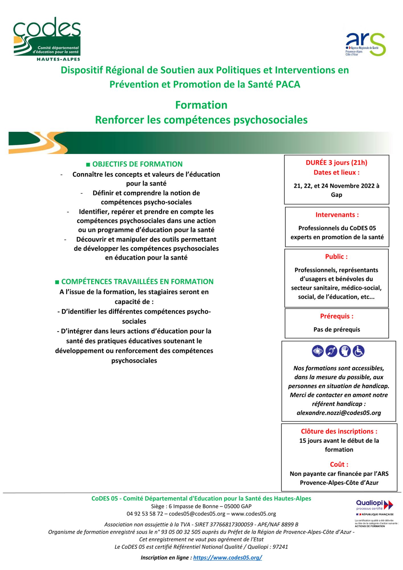 La formation est financée par l’ARS. Elle est gratuite pour les participant.e.s. Les frais de déplacement et de repas sont à la charge des participant.e.s.