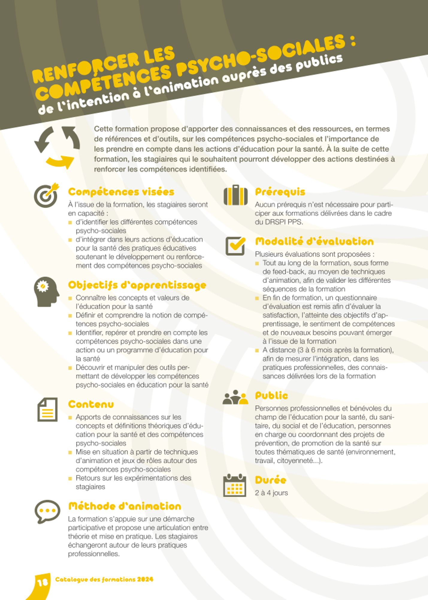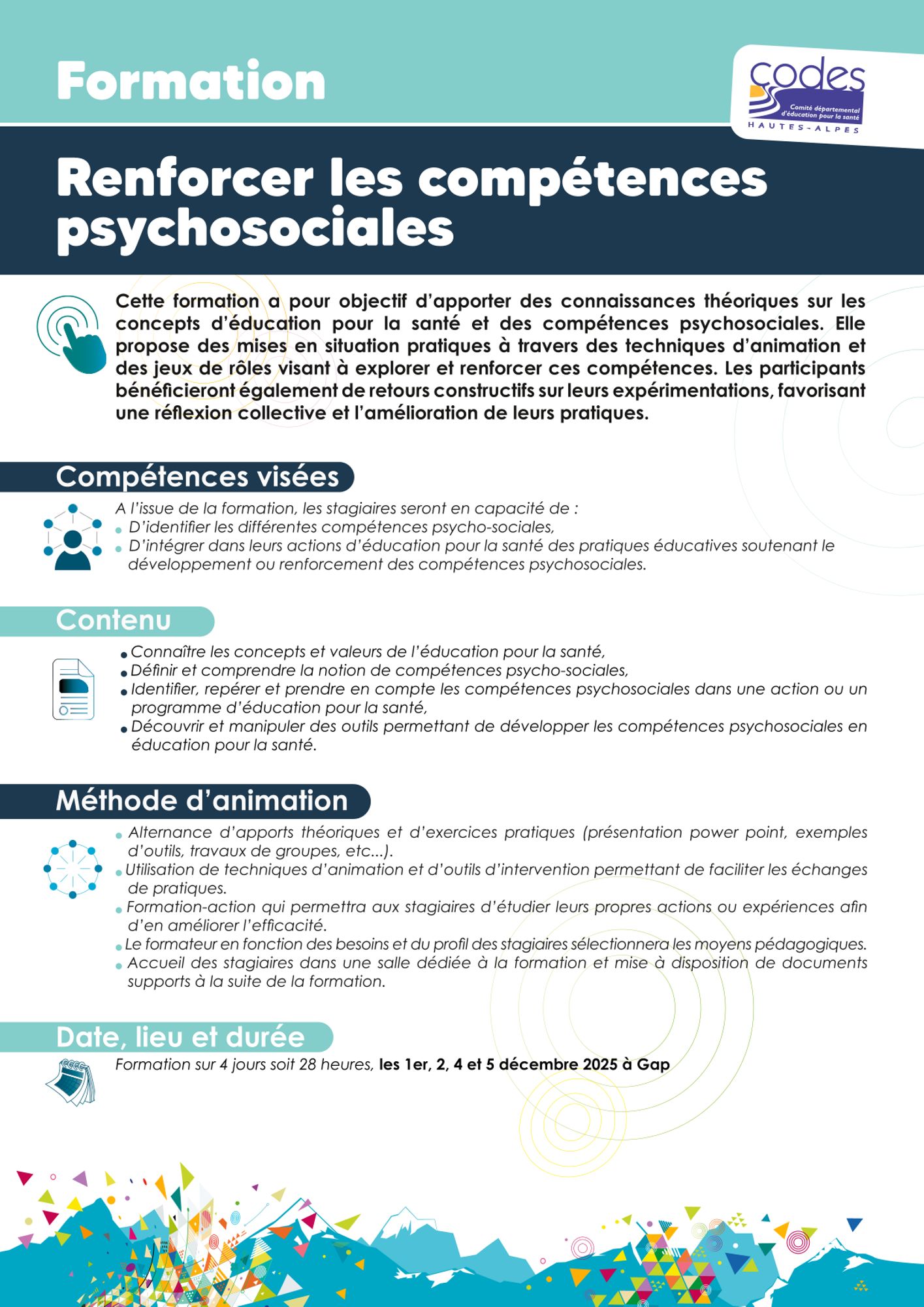 Cette formation propose d’apporter des connaissances et des ressources, en termes de références et d’outils, sur les compétences psycho-sociales et l’importance de les prendre en compte dans les actions d’éducation pour la santé. À la suite de cette formation, les professionnels qui le souhaitent pourront développer des actions destinées à renforcer les compétences identifiées.