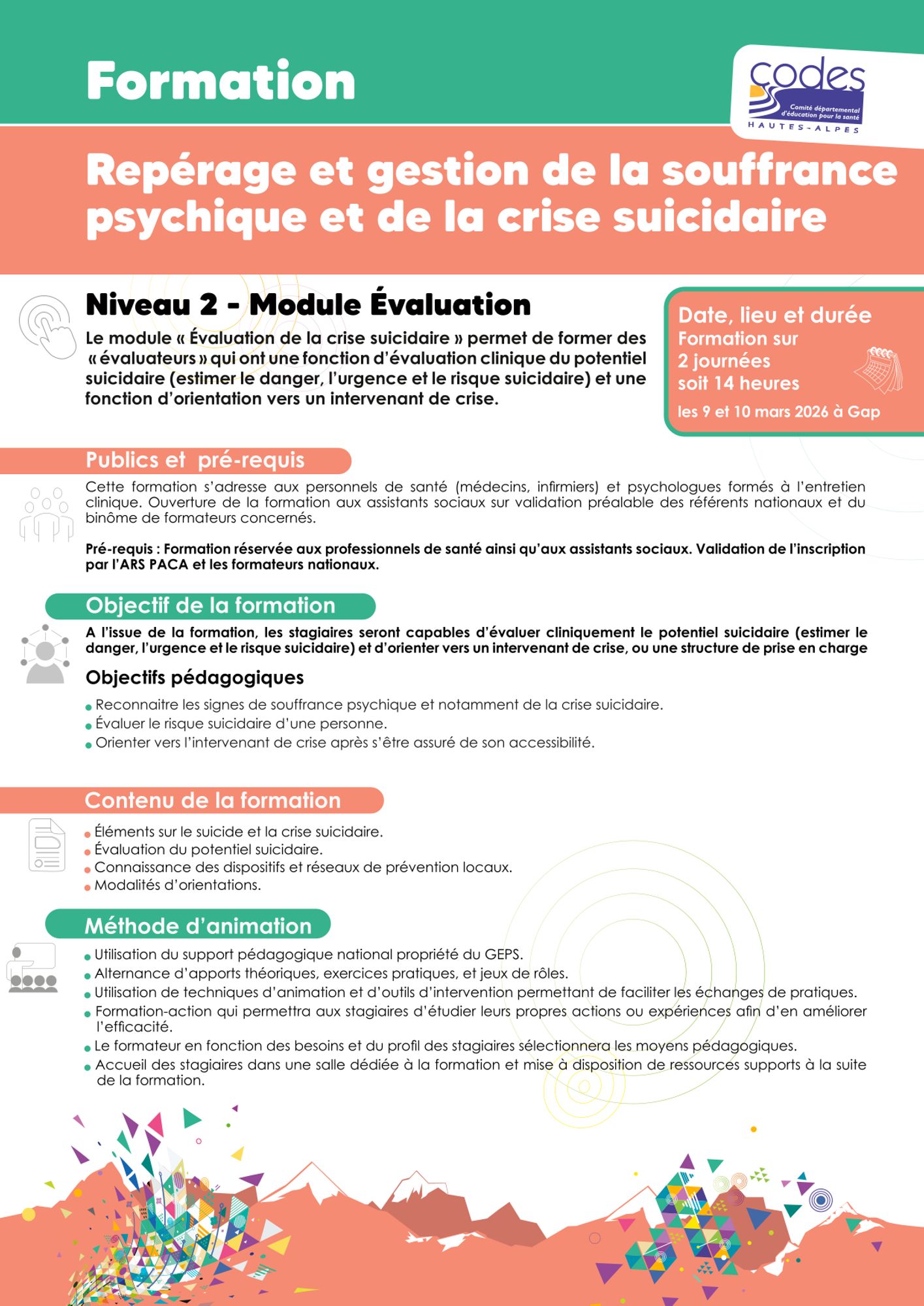 Formation dispensée par des formateurs « Crise suicidaire » accrédités par le Groupement Étude et Prévention Suicide (GEPS).