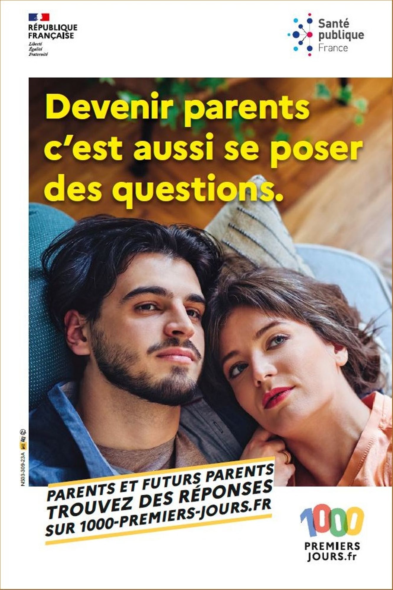 Cette affiche de promotion du site 1000 premiers jours est destinée à être affichée par les professionnels dans les lieux accueillant des futurs parents et jeunes parents.