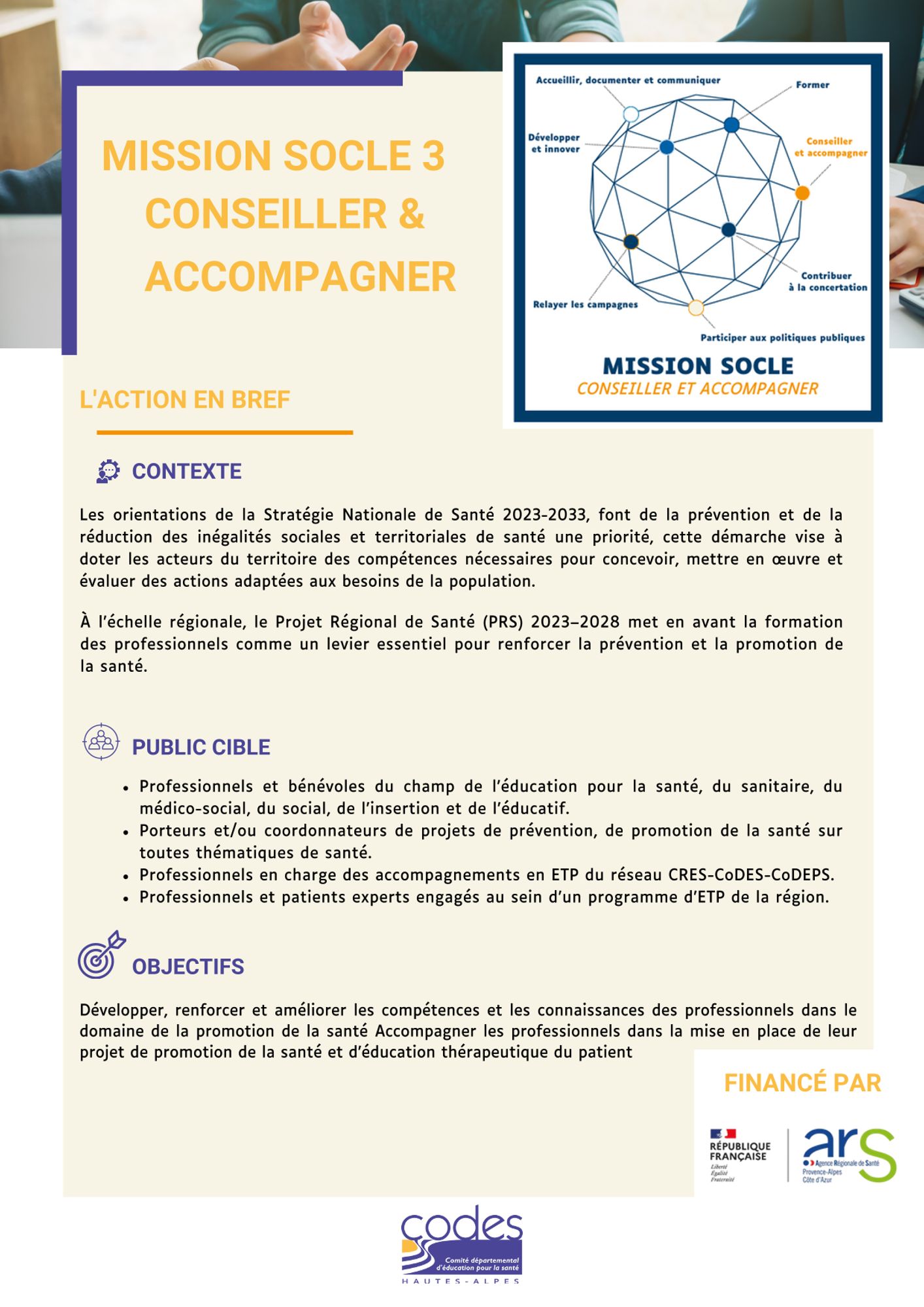L’objectif général de l’action globale « MISSIONS SOCLES » est le suivant : « De janvier 2025 à décembre 2028, renforcer la qualité des actions de promotion de la santé et d’éducation pour la santé dans le département des Hautes-Alpes ». Cette action est composée de 7 sous-actions qui sont les suivantes : accueillir, documenter et communiquer ; former ; conseiller et accompagner ; contribuer à la concertation ; participer aux politiques publiques ; relayer les campagnes ; développer et innover.