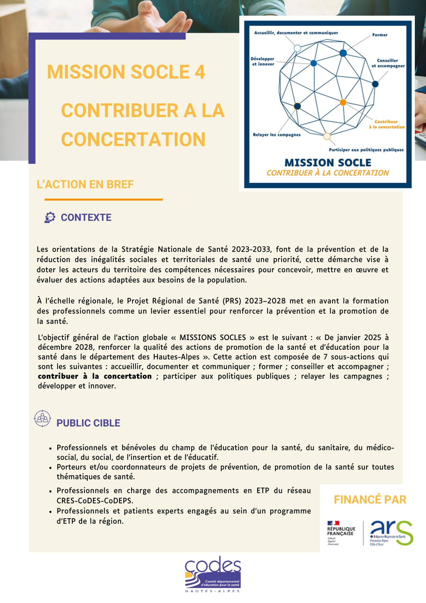 L’objectif général de l’action globale « MISSIONS SOCLES » est le suivant : « De janvier 2025 à décembre 2028, renforcer la qualité des actions de promotion de la santé et d’éducation pour la santé dans le département des Hautes-Alpes ». Cette action est composée de 7 sous-actions qui sont les suivantes : accueillir, documenter et communiquer ; former ; conseiller et accompagner ; contribuer à la concertation ; participer aux politiques publiques ; relayer les campagnes ; développer et innover.