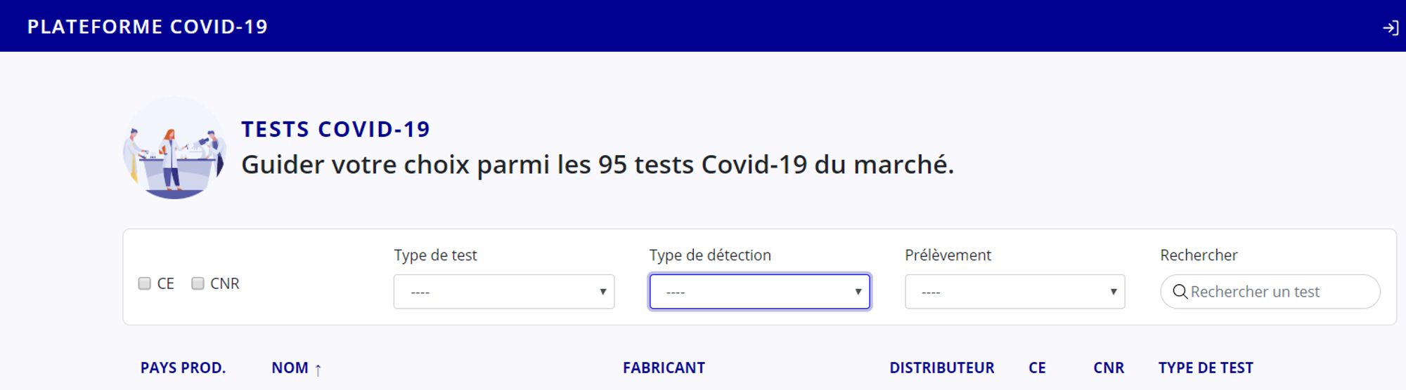 En plus du nom, du fabriquant et du distributeur, vous y retrouverez le pays de production, la validation par la CE et le CNR et le type de test dont il s'agit (test rapide, sérologie automatisée, RT-PRC, LAMP). Il est également possible de filtrer par type de détection : anticorps ou ARN viral.